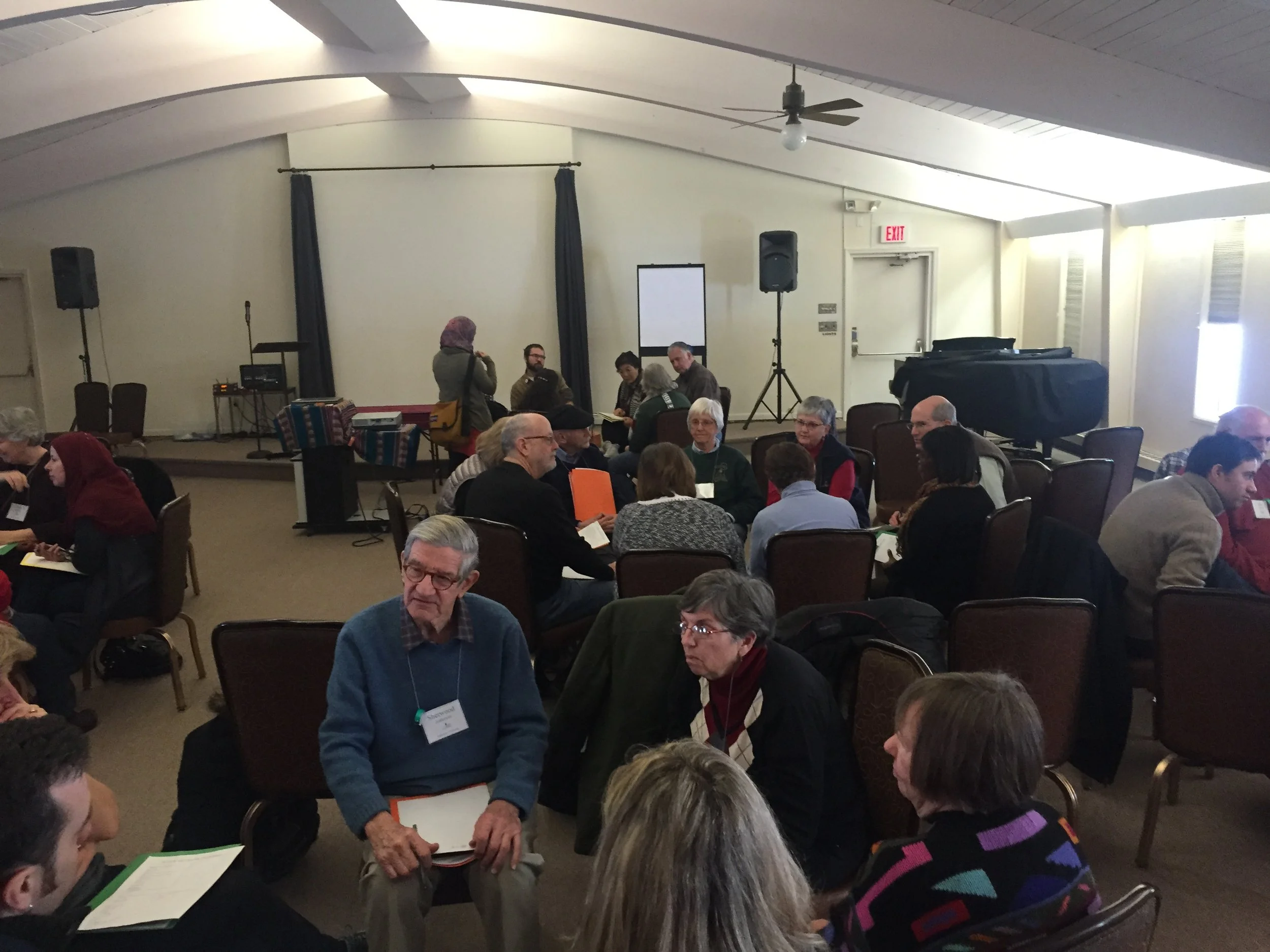 The training was a follow-up to the webinar that our Synod produced on Sanctuary at the end of 2016 and was a time of training in direct action, nonviolence, anti-racism considerations around the participation in Sanctuary and an introduction to the multi-disciplinary Sanctuary movement of today. We discussed responses such as Sanctuary in the Streets, the traditional Sanctuary model, community and individual accompaniment and the ranges of those in need of Sanctuary from the targeting of the Muslim community, refugees and immigrants. Each day we engaged in the grounding practices of worship and scriptural meditation. Our time together closed with direct action planning and communal evaluation.